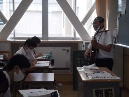 英語への興味関心を高めるため、教科担当者が自らギターを演奏し、生徒と共に歌っています。今日はビートルズの名曲「ヘイ・ジュード」でした。