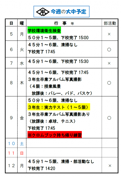 9日(金)に、クロムブック持ち帰り練習をします。カバーや袋の準備をお願いします。