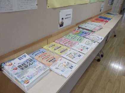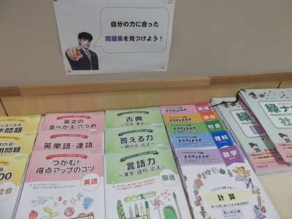 また、3年生教室の廊下には、各種問題集が展示されています。自分に合ったものを自分で選択し、希望購入します。これも、具体的な取り組みになります。