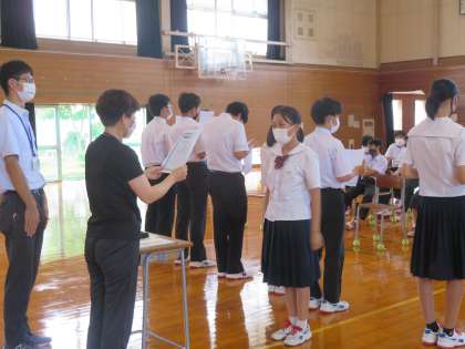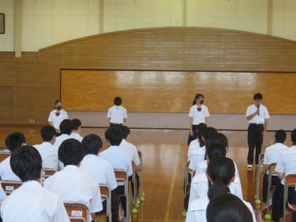 まずはじめに学級代表が1学期の振り返りを発表しました。受験生として授業に取り組む姿勢が良くなったという意見が多くあげられました。