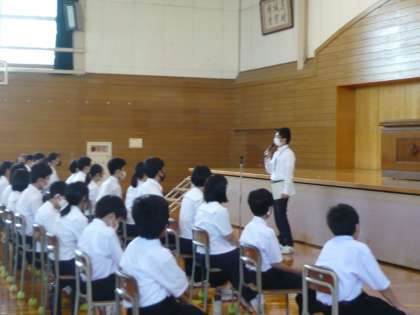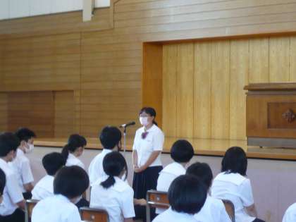 生徒会長から、「8月10日(火)「大中の日」には地域でのボランティア活動や家庭でのお手伝い等、自主的に活動をしましょう。」と呼びかけがありました。(写真上)