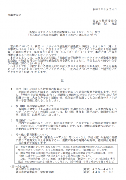 市教育委員会から「新型コロナウイルス感染症警戒レベル『ステージ3』及び『まん延防止等重点措置』適用下における対応等について」の連絡がありました。