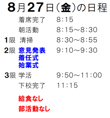 さて、8/27(金)の日程は次のとおりです。もちものについては、夏休みのしおりを確認してください。