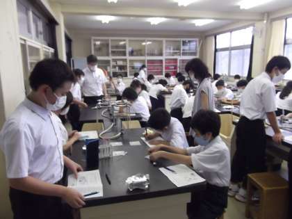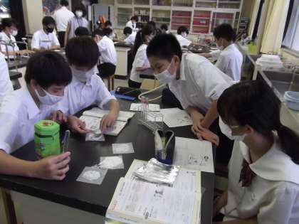 1−1は3限目、理科室で理科を行っています。4種類の白い粉末の特徴を探っています。手ざわりから始まり、ルーペを使って拡大して観察したり、水への溶け方や加熱したときの様子を調べたりするなど、各班の課題に沿って実験が進められています。