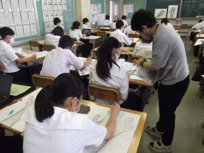 鉛筆による手の素描にチャレンジしています。指は平坦ではなく、関節の部分に膨らみがあるなど、観察と描写のポイントを学びながら学習を進めています。