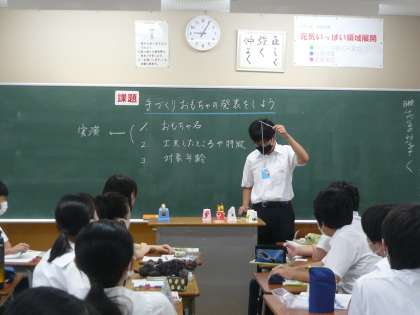 3年生の教室では、幼児のための手づくりおもちゃの発表をしています。実演を交えながら、分かりやすく発表しています。