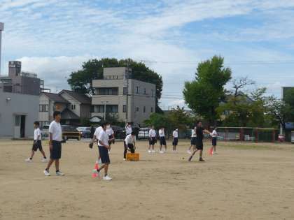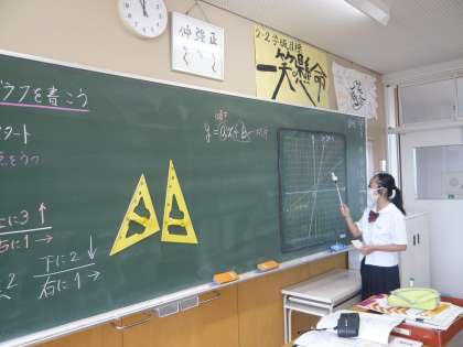 2年生の数学は、一次関数のグラフを書いています。距離をとりながら話合っています。(写真左、中)体育では、先生のノックを上手にキャッチしています。(写真右)