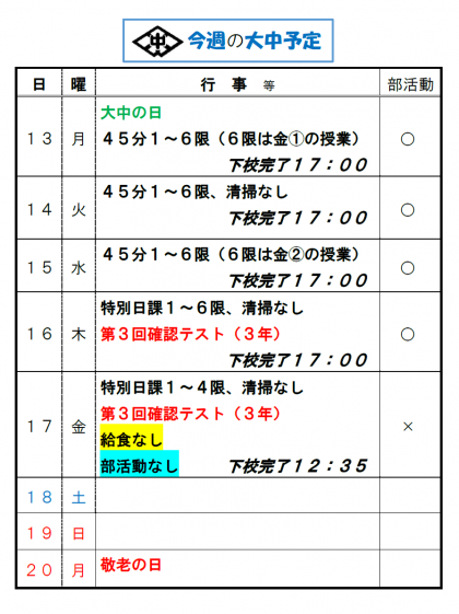 なお、17日(金)は給食なし12:35下校完了です。午後の時間は有意義に過ごしましょう。
