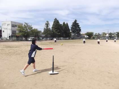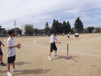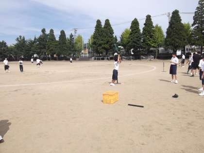 1−1の体育の授業の様子です。ソフトボールの、バッティングの練習をしています。ティーバッティングですが、なかなか思ったように球が飛んでいかないようです。土井先生から「地面と水平に」との助言が何度も出されています。