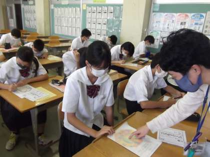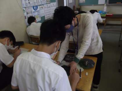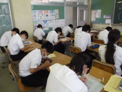 2−2の美術の授業の様子です。2年生は今、ガラスアートで、時計の文字盤を製作しています。下絵の仕上げに入っている人、下絵をトレースしている人、進捗状況は様々ですが、世界に一つしかないオリジナル時計の製作に、みんな集中して取り組んでいます。
