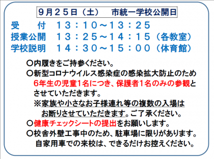 市内6年生の児童及び保護者の皆様を対象とした、市統一学校公開日についての案内文を掲載しました。
