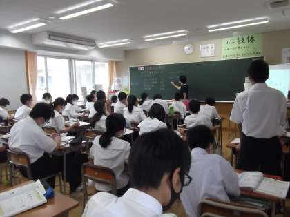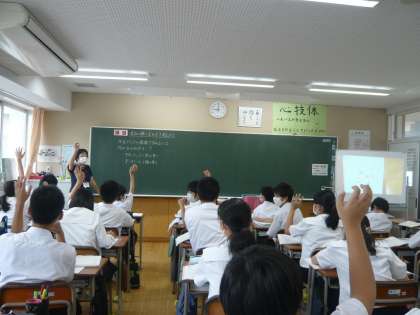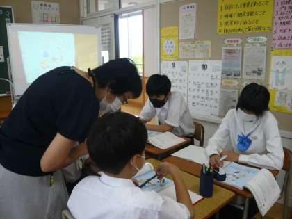 「未知の数の求め方を考えよう」の学習課題で、まずはグループで話し合い、考えをまとめました。積極的な挙手、そして発表、1年1組の授業は活気があります。