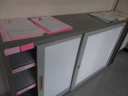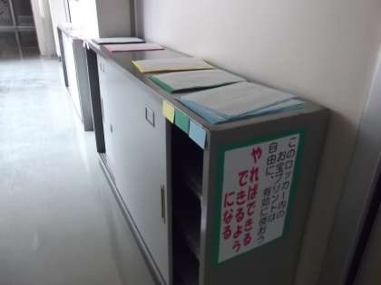 会議室前と印刷室前に、自主学習を支援するコーナーを設けました。昼休みの自主学習会「大中寺子屋」と合わせ、大中生の「学びたい」という思いをサポートしていきます。