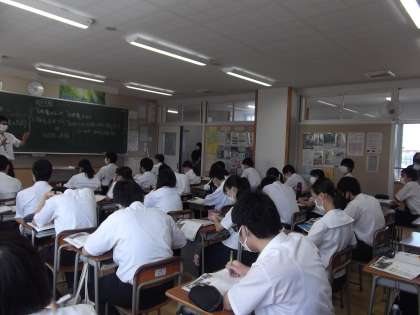 写真は前半の、2年2組理科(上)と、3年2組社会科(下)の授業の様子です。