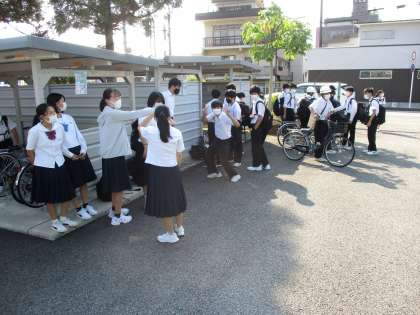 呼びかけをしながら、生徒会長が「ヘルメットはしているけれど、あごひもを締めていない人が多い」ということに気付いていました。しっかりあごひもも締めて、自分の命をしっかりと守ってほしいです。
