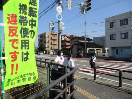 ヘルメットを着用することや、横断歩道では自転車を引いて渡ることを呼びかけました。