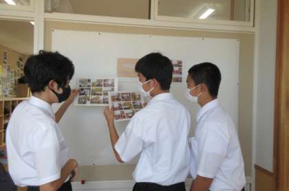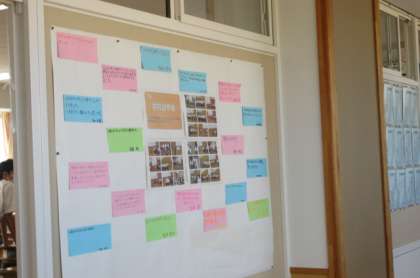 映像を見て、自分でよかったと思うところや今回新たに見つけた友達のよいところなどを書きました。書いたものは、生徒がレイアウトを工夫して掲示をしました。