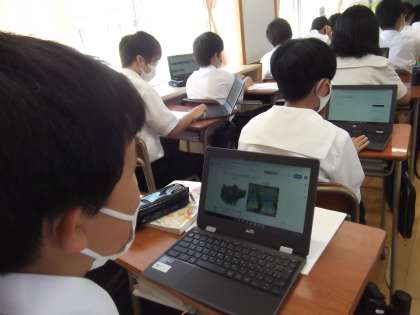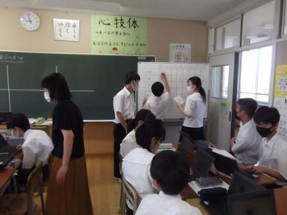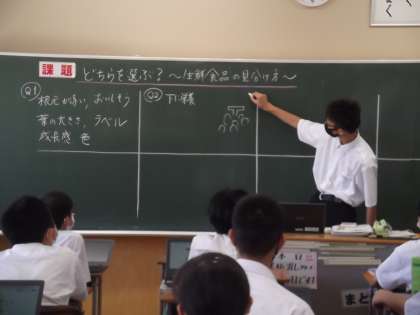 昨日に引き続き、谷口教諭が授業公開を行いました。本時は生鮮食品について学びました。クロムブックに、野菜や果物等の生鮮食品の画像によるクイズが載せられており、「おいしい方」「おいしい部分」を選ぶようになっていました。班活動で回答を考え、根拠付けて発表していました。中には黒板で図示しながら説明する生徒もおり、生徒は積極的に授業に参加していました。