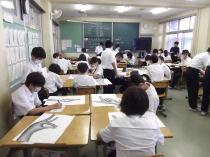 自分の手を、鉛筆画で表現しました。友だちの作品を鑑賞し、どこがどのようによいのか、相互評価をしています。