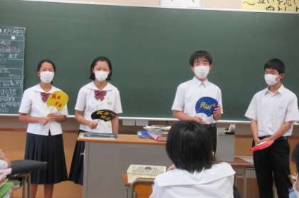明日は県中学駅伝です。昨日は全校で壮行会を行いましたが、今日は学級でミニ壮行会を行いました。同級生が作成した応援うちわを手に「がんばってきます!」
