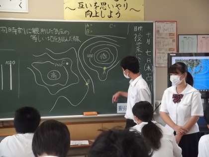 気象情報や天気図に使われる記号につて、班毎に調べ発表しています。