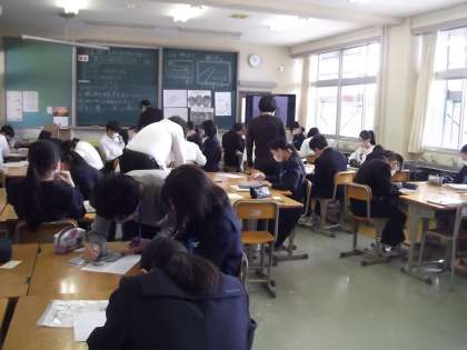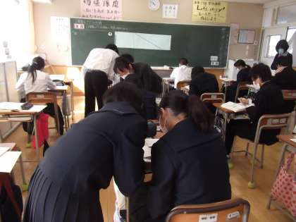 カーフェリーとジェットフォイルのすれ違うポイントを、1次関数のグラフを利用して解決しようとしています。とてもいい雰囲気で、自然と学び合いが始まります。