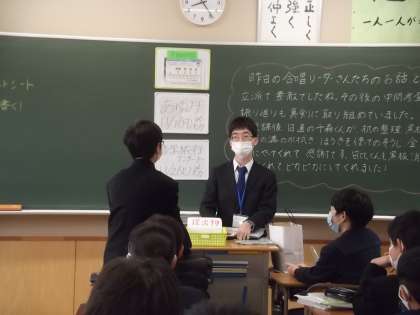 10/26(火)から4週間、教育実習を行います。富山大学理学部の学生で、数学の授業(学習指導)や、1年1組での道徳・学級活動の指導等について学びます。
