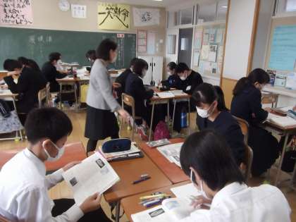 1次関数の中で、単位時間の変換に問題意識を高めて学習に取り組んでいます。教育実習生も、生徒の思考の高まりを探っています。