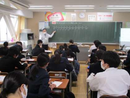 3年数学では、「身のまわりにあるいろいろな関数を調べてみよう」を課題に、紙を2等分して切り続け重ねたときの高さについて考えていました。生徒の中には、パズルゲームで2乗を積み重ねるものと結びつけて考えている姿も見られました。(写真・上)