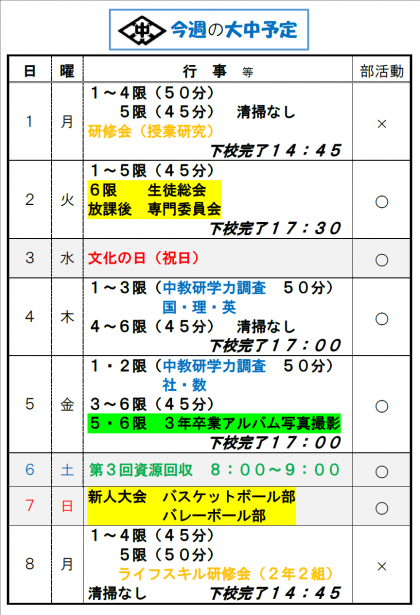 今週は、中教研学力調査が行われます。これまでの学習の成果を振り返る機会となります。今の立ち位置を確認して、今後につなげていきましょう。