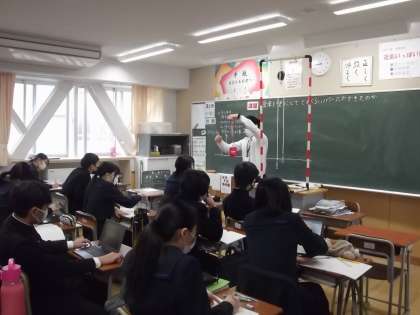 滑車を使って、「仕事」について学習しています。「理科で言う『仕事』は、『将来の夢』とは違っていたね」と、分かりやすい説明と興味の沸く学習課題で授業が進められていました。
