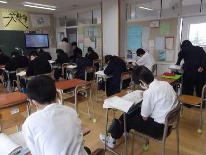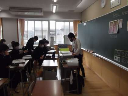himやherを使って、人物を紹介する英文を学んでいます。1年生は、挙手による発言やつぶやきが多く、授業に活気があります。