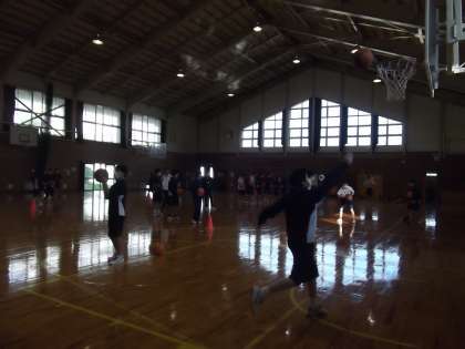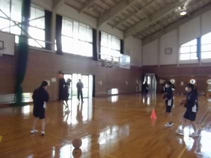 バスケットボールの授業です。2ステップでシュートを打つ練習をした後、友達からのバウンドパスを受けてからのシュート練習に入りました。