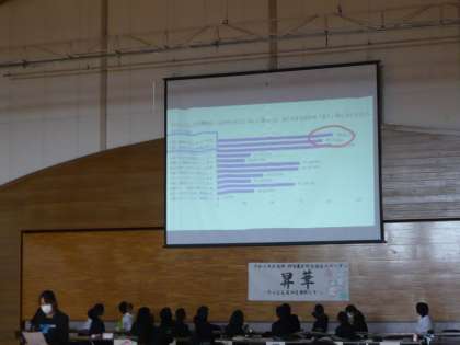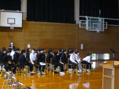 前期生徒会から、クロムブックの使用について、全校生徒でアンケート調査を行った結果の報告がありました。自分たちで創ったルールについての現状をデータ化し、一層みんなでルールの遵守に努めようと呼びかけがありました。自分たちで自分たちの生活をよりよくしようとする自治活動が行われています。