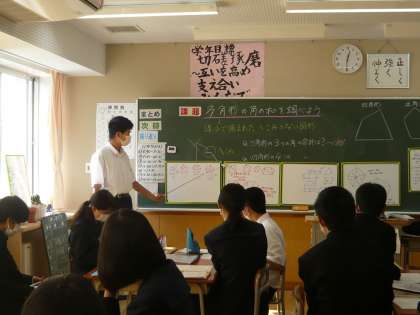 多角形の角の和をいろいろな方法で求めました。他の班の考えも参考にしながら、学びを深めています。