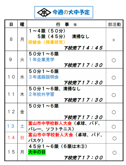 また、3年生は、10日(水)午後に進路説明会があります。保護者の皆様にも来校いただいて、これからの進路選択に向けての日程や注意点を確認します。