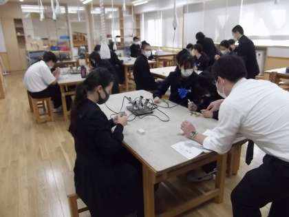 基盤に部品をはんだ付けしています。作業しているときの集中した表情と、終えた後のホッとした表情に大きな差があり、それが授業を楽しんでいる答えにもなっています。