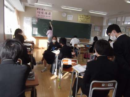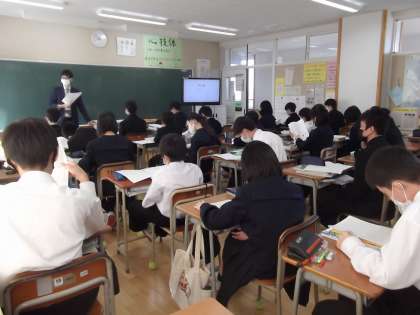 先日行われた、県中教研学力調査の答案が返却され、解説を聞いています。考える上でのポイントや、既習事項の振り返りがあり、生徒は真剣に話を聞いていました。