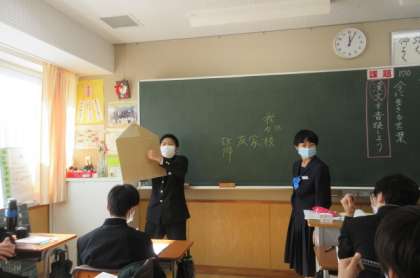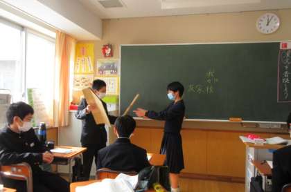 故事成語の授業をしています。生徒代表が「矛盾」の由来を演じてくれました。たいへん上手でした。