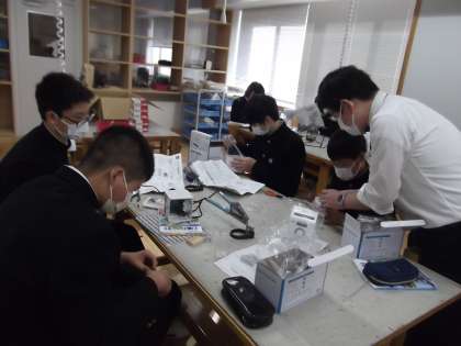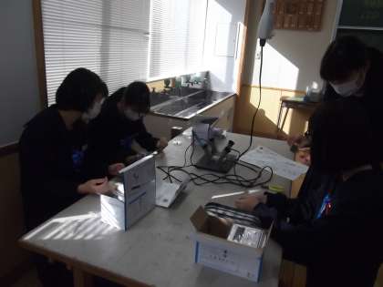 エコキューブラジオを製作中です。はんだを使い、部品を基板に取り付けています。回路にうまく電流が流れるか確認しながら、慎重に作業を進めています。
