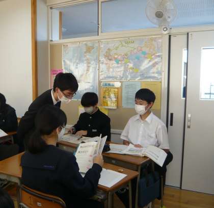 「比例と反比例の利用」についての学習です。ポップコーンを買い終わるまでにかかる待ち時間を個人やグループで考え、発表しました。ICT機器を使いながら、分かりやすい授業が展開されていました。