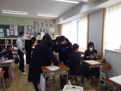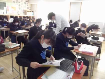 3年生が進路相談会をしている中、2年生は「進路のしおり」を使って進路学習を行いました。まずは興味関心を高めるため、自由に「進路のしおり」を読み合わせたり、クロムブックで調べたりしました。