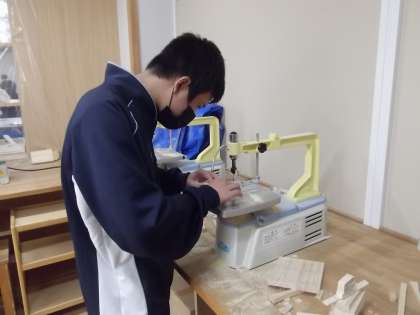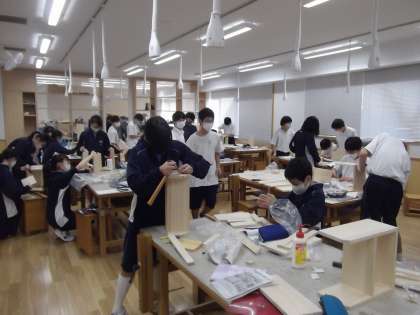 1年生は技術の授業で、木材加工として本立てを作っています。のこぎりやげんのう等、様々な道具を使って楽しそうに作業しています。