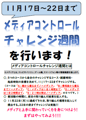 11/17(水)から22(月)まで、メディアコントロールチャレンジを開催しています。5つのコースからチャレンジするコースを選ぶとともに、就寝・起床時刻の目標を決めて実施します。