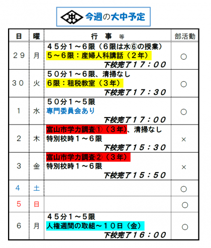 12月2日(木)、3日(金)は部活動がありません。下校完了時刻が早くなります。