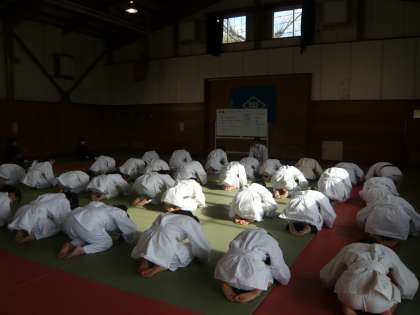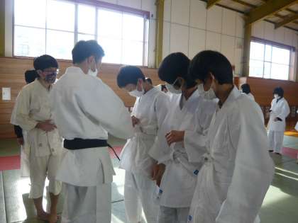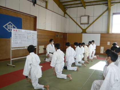 柔道着の着方や礼法、柔道の歴史等について学びました。背筋をピンと伸ばし、相手に対する敬意を表現していました。