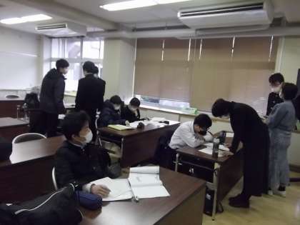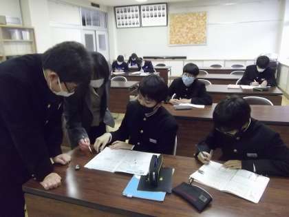 今日は昼に12名、放課後に13名の大中生が自主学習に励みました。寺子屋のスタート時は、何をするかを決めていないで、会議室内にあるプリントを適当に選んで行うという姿が多かったのですが、今は何をするか決めて、すぐに学習をスタートする人が増えてきました。また、今日は、3年生が2年生に教える姿が見られました。放課後は、3年生に対し数学の教員がマンツーマンで教える場面がありました。