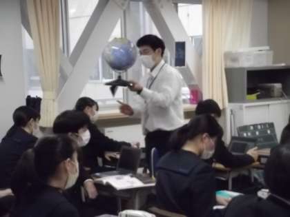 12星座の見え方について学んでいます。星座を教室内に貼り、大川先生が地球儀を持って移動することで、見え方を確認しています。