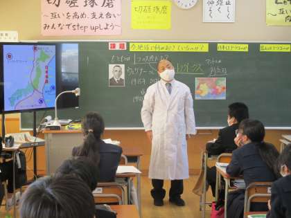 12月10日(金)、なにやらいつもと違う雰囲気に2年1組のみんなはざわついています。あれ?いつものせんせいじゃない...本日は、校長先生による「地震の特別授業」です。初めて校長先生の授業を受けるとあってみんな大喜びです。