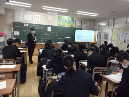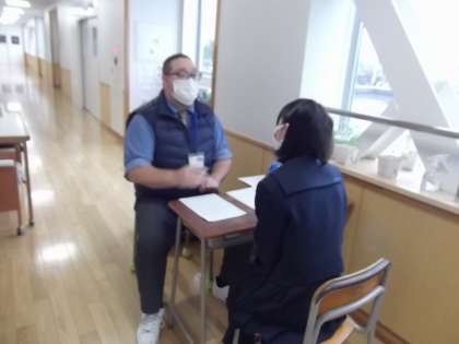 仮定法を使った、英語の長文の読解に挑戦しています。また廊下では、インタビューテストが行われ、個別の指導の場面も設けられています。